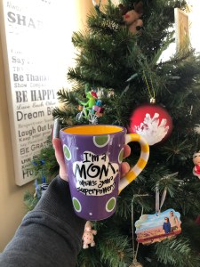 The mug reads: ” I’m a Mom- What’s your superpower?” Penny also included some coffee, flavored syrups, and heart measuring spoons. I’ve already used it a few times!